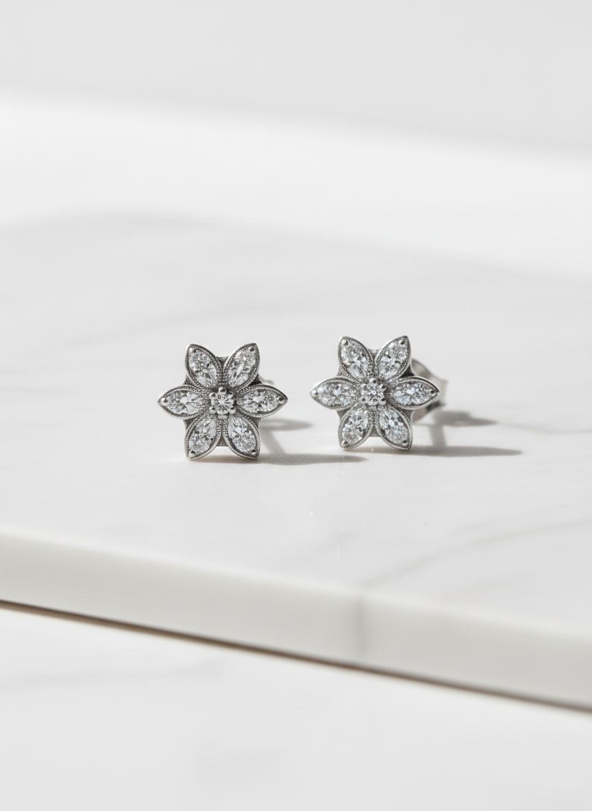 Blooming CZ Flower Earrings. Silver Tops Studs in Pure 92.5 Sterling Silver. Good to go for every occasion from party to office to regular wear. Note: Images are enlarged for better viewing.