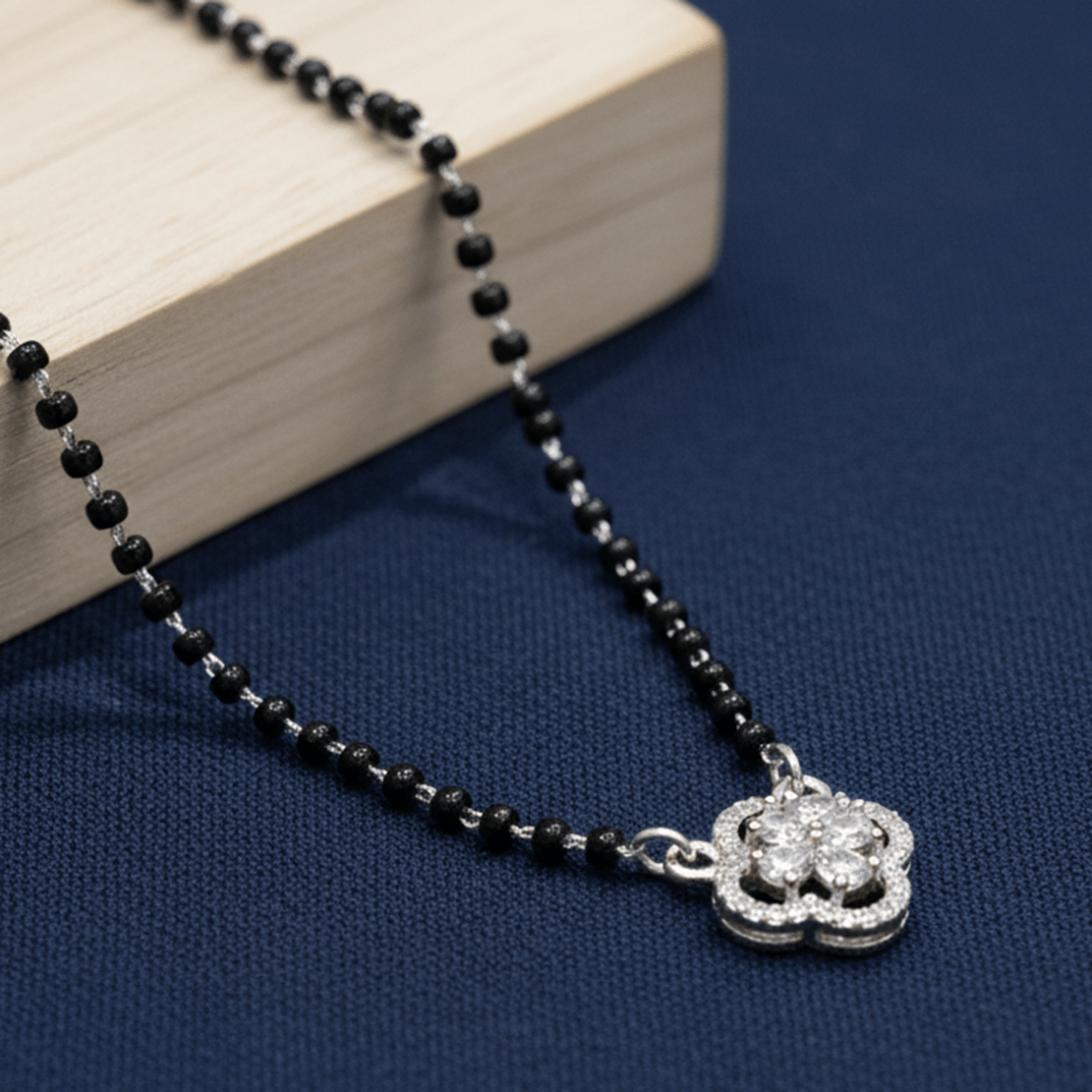 The clover CZ mangalsutra necklace showcases intricate detailing with sparkling cubic zirconia accents. The clover design symbolizes luck, fortune, and elegance. Perfect for daily wear or special occasions, this mangalsutra offers both sophistication and spiritual significance.