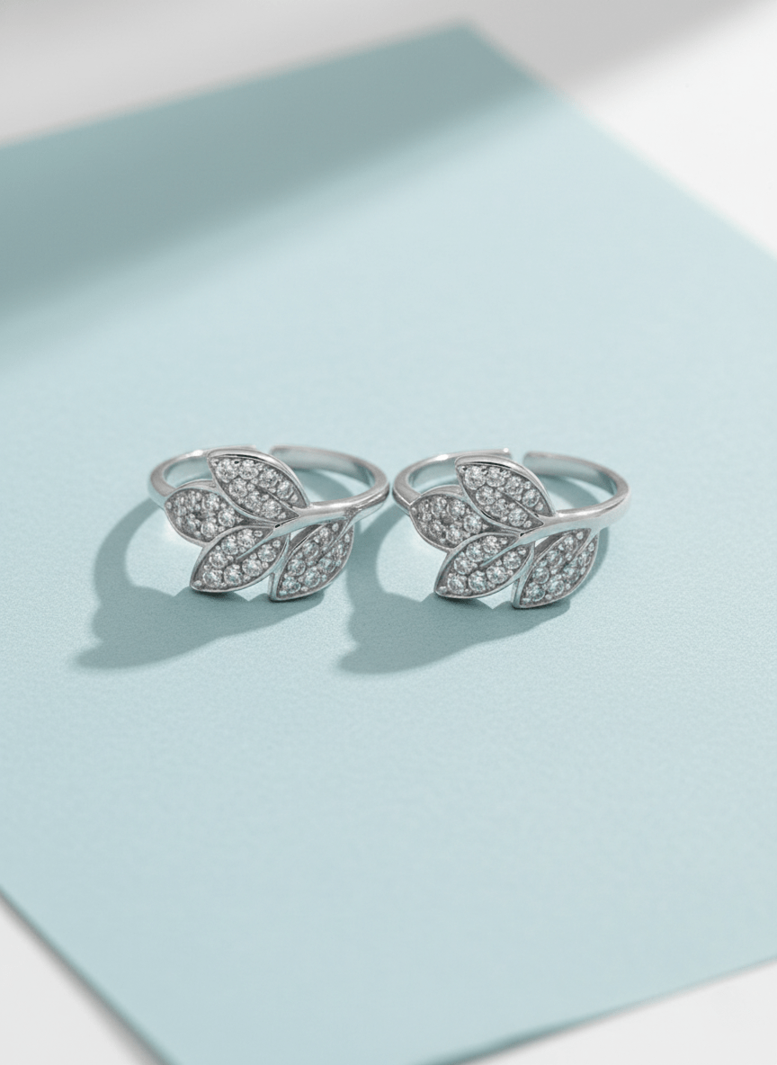 These CZ leaf design toe rings feature a graceful leaf motif paved with cluster-set stones that catch the light from every angle. The open, adjustable band lets you gently tighten or loosen the fit so you can wear them comfortably on different toes. Their delicate look makes them perfect for everyday wear, festive outfits or gifting to someone who loves minimal yet eye-catching jewellery. Pair these CZ leaf design toe rings with matching anklets or rings from our collection to complete your look.