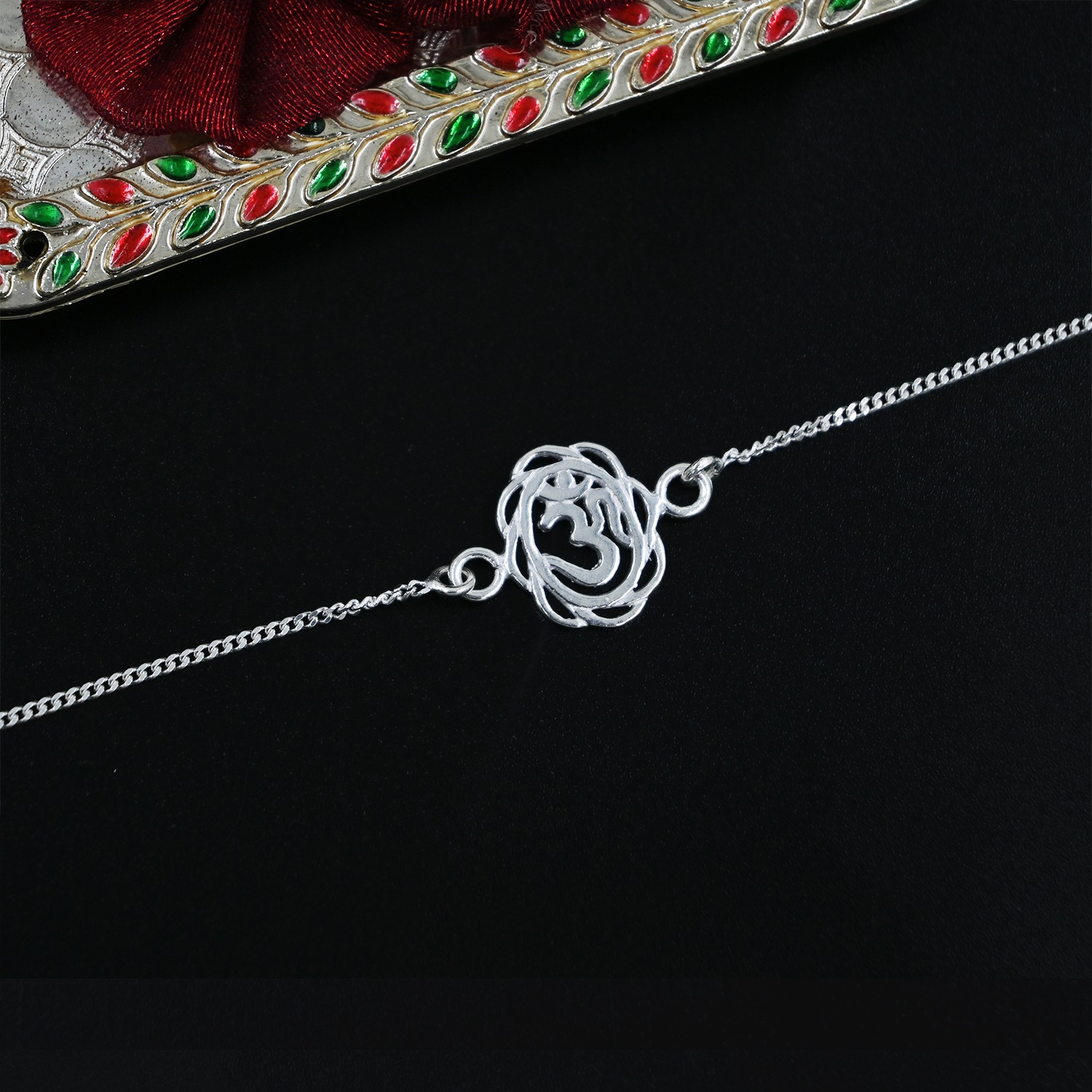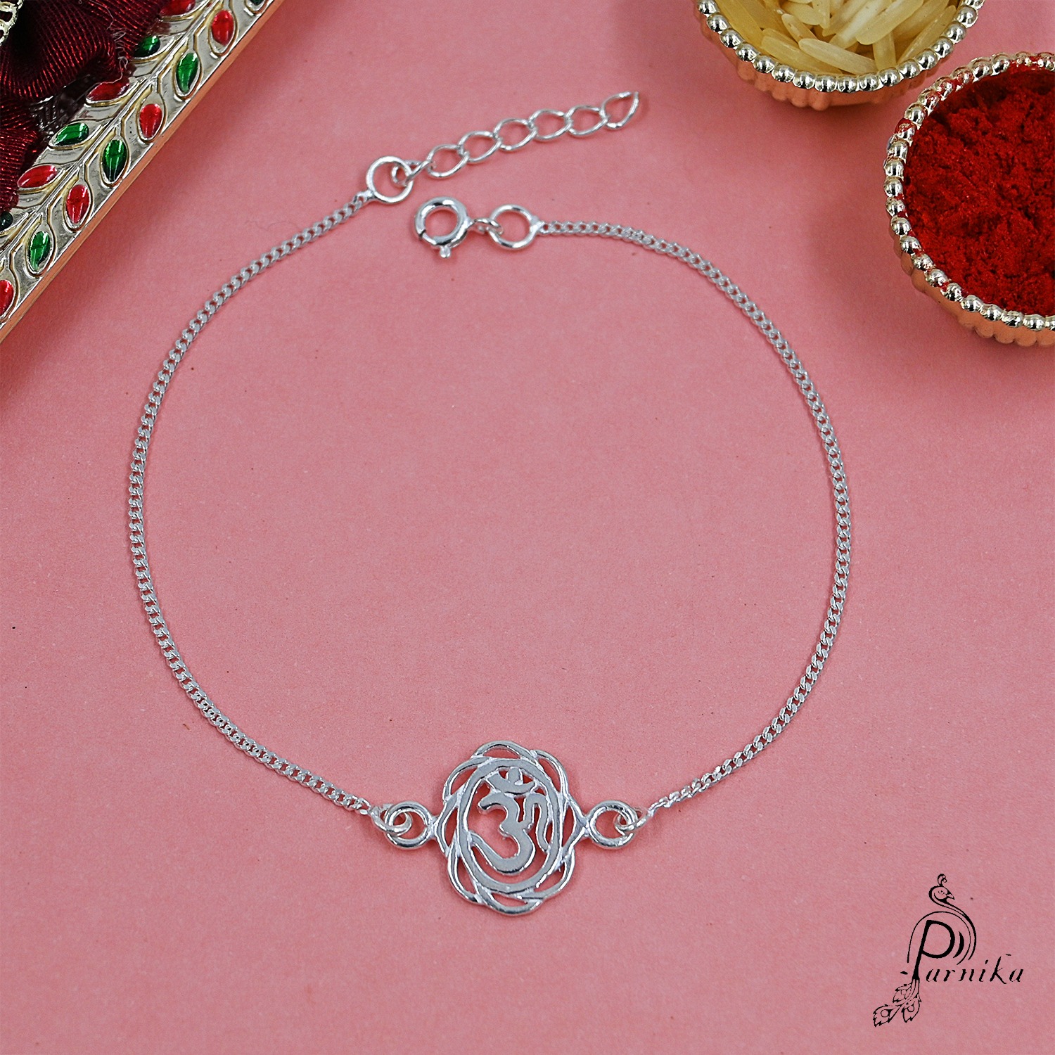 Designer Om Rakhi Bracelet in silver for brother, Parnika 925 Silver Rakhi Bracelet For Brother in Pure 92.5 Sterling Silver for Boys and Men | Chandi ki Rakhi | With Roli Chawal