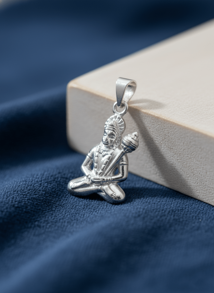 This beautiful pendant features Lord Hanuman in a serene seated posture holding his iconic gada (mace), symbolizing strength, courage, and unwavering devotion.