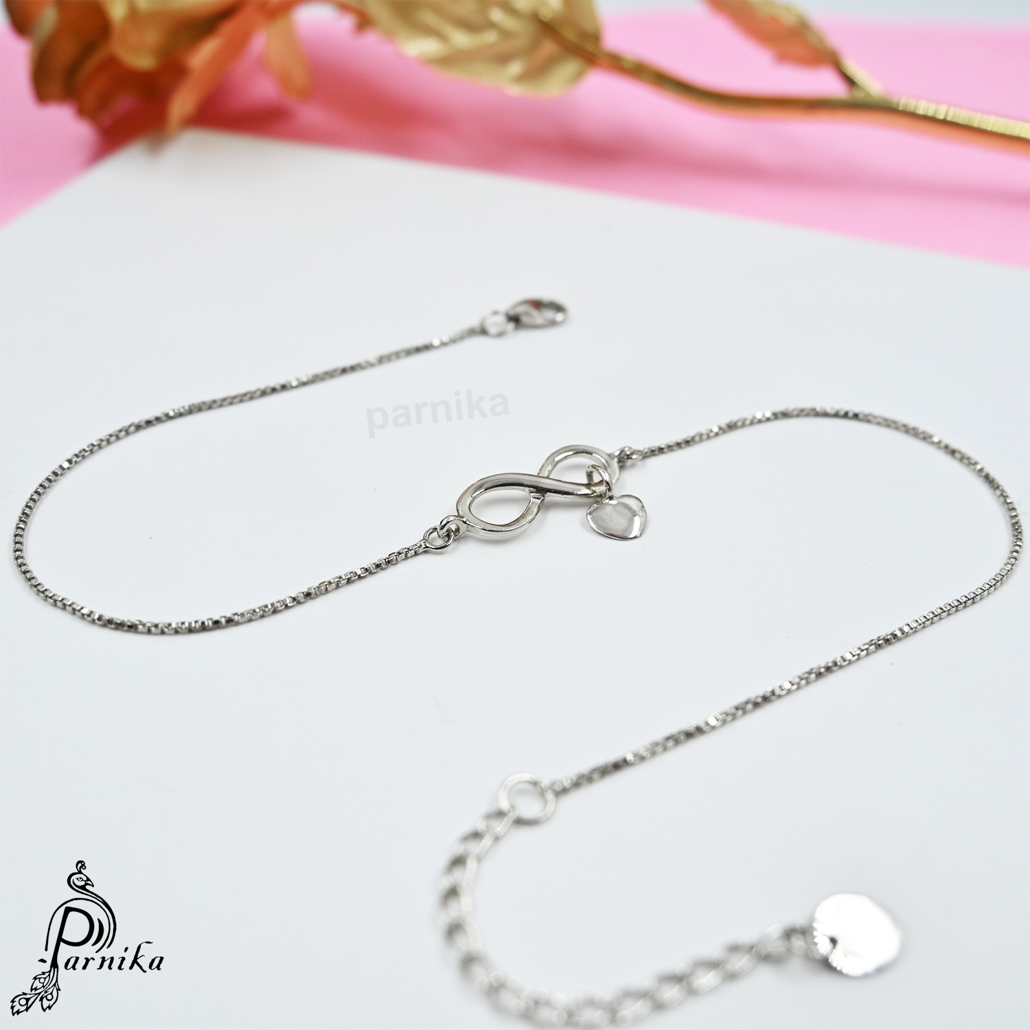 Celebrate infinite love and graceful style with this beautifully crafted silver payal design in pure 925 sterling silver. Featuring a delicate chain and a finely detailed charm that combines the infinity symbol with a heart, this anklet is a meaningful piece of jewelry for anyone who believes in love that knows no end.