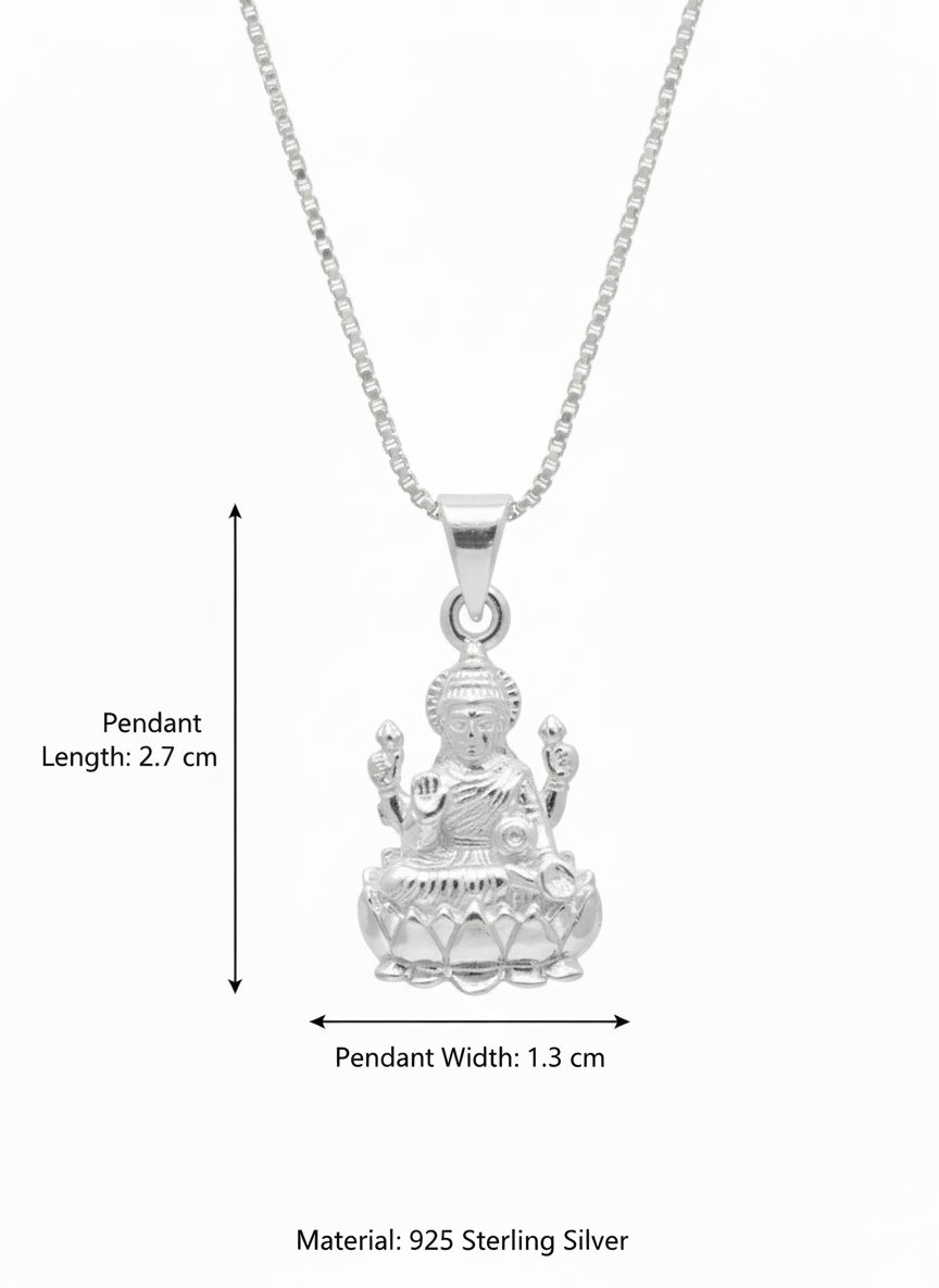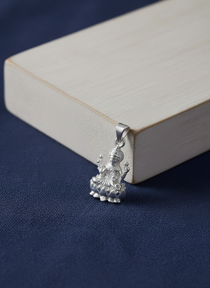 Lakshmi pendant silver – Our beautiful lakshmi pendant features an intricately carved goddess figurine seated gracefully on a lotus base. This divine lakshmi pendant showcases masterful craftsmanship with detailed engravings representing Lakshmi, the Hindu Goddess of wealth, prosperity, and abundance.