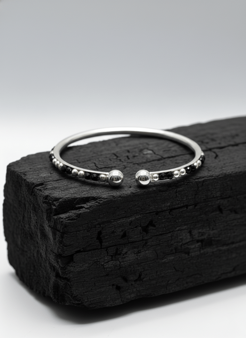 Featuring an elegant alternating pattern of black and silver beads, this nazariya baby bangle beautifully balances tradition and style. The black beads represent classic nazariya (evil eye) protection, believed to ward off negative energy, while the polished silver beads add a refined and graceful touch.