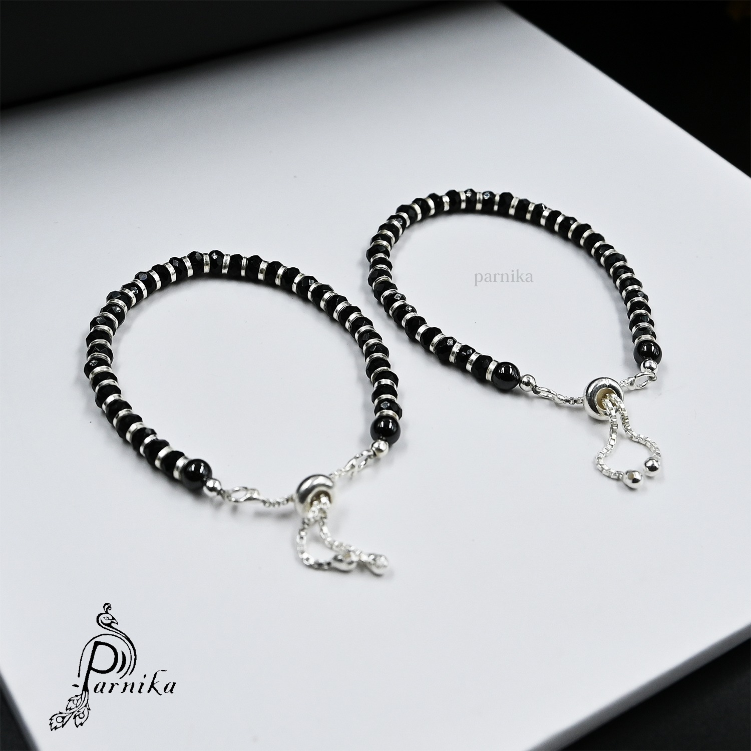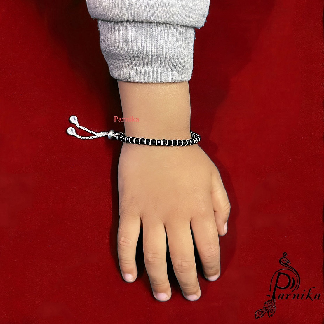 Introducing the “Trendy Adjustable Silver & Black Crystals Baby Nazariya Kids Silver Bracelet” – a cool and adaptable accessory made just for kids. This bracelet is crafted from really good silver (the kind that stays shiny) and has a trendy design with black crystals that sparkle.