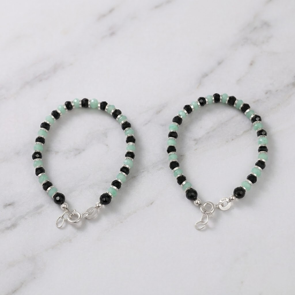 These beautiful bracelets feature soft turquoise beads strung on a gentle, baby-safe cord, finished with a subtle silver-tone accent. The lightweight design ensures your baby feels comfortable all day long, whether they are sleeping, playing, or being carried around by family.